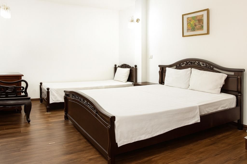 A spacious and comfortable room featuring one double bed and one single bed, ideal for small groups or families. The room offers classic wooden furnishings, clean modern amenities, and a bright window for natural light.